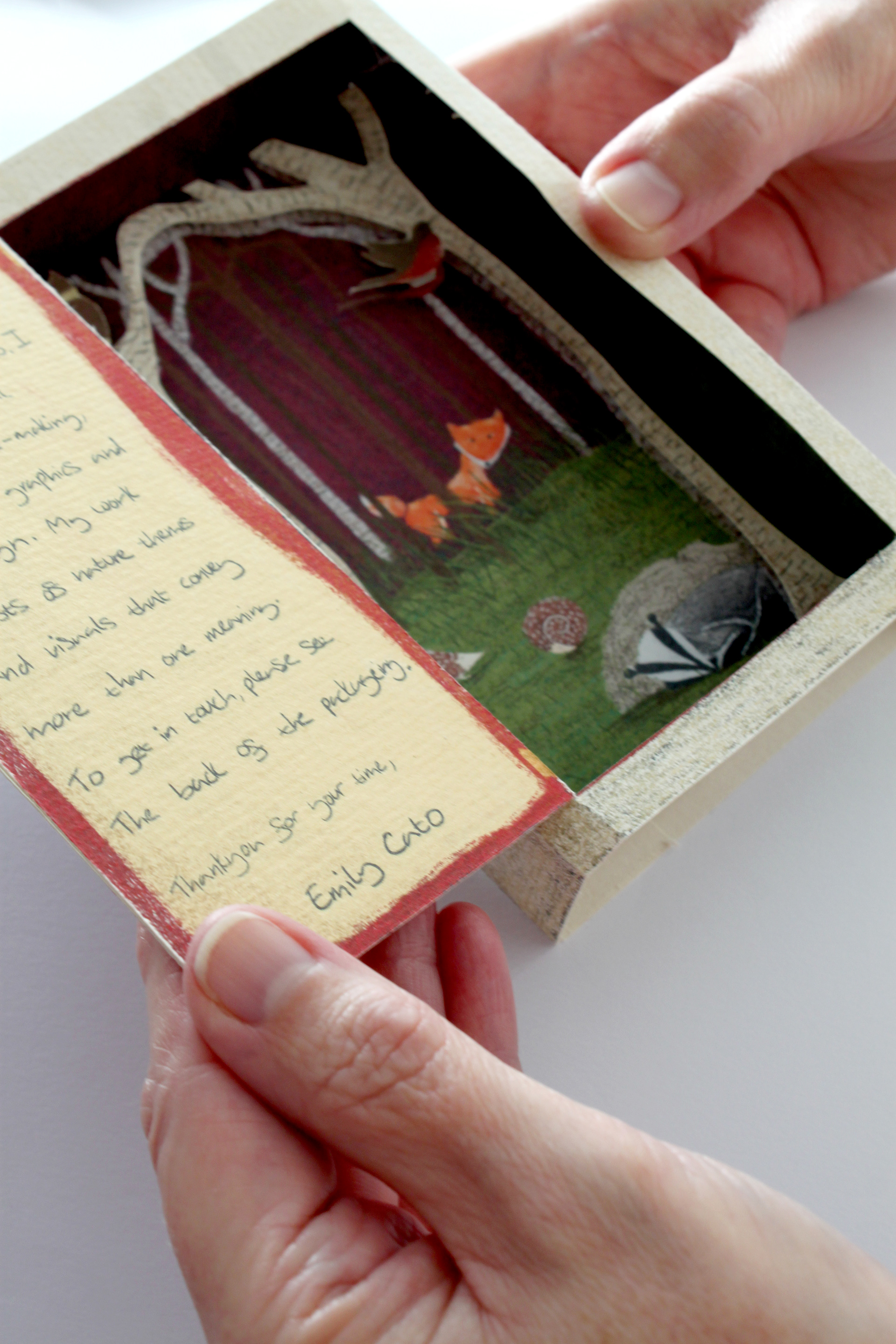 A self-promotion mailer project in the form of a doorway. Once the door is opened, the viewer is greeted with a personal message and a woodland scene.